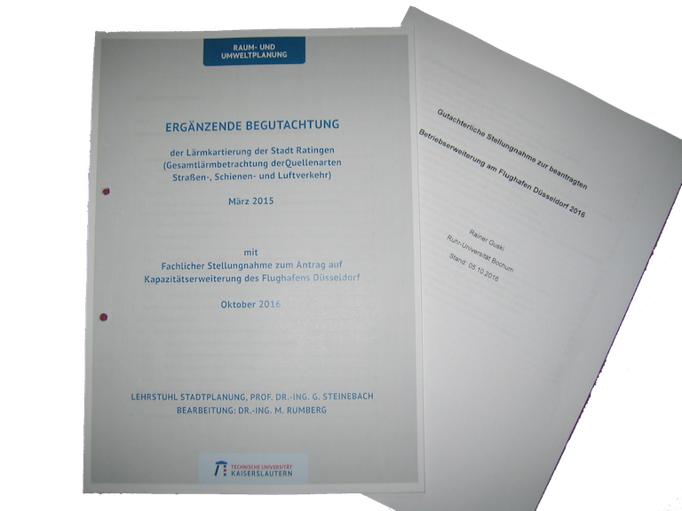 Ratinger gegen Fluglärm e.V. hat zwei Gutachten erstellen lassen, die die untragbaren Folgen einer Steigerung der Flugbewegungen am Düsseldorfer Flughafen darstellen. Professor Rainer Guski hat die gesundheitlichen Risiken einer gesteigerten Flughäufigkeit und der damit verbundenen erhöhten Lärmbelästigung herausgearbeitet. Professor G. Steinebach/Dr.-Ing.M. Rumberg haben eine Gesamtlärmbetrachtung für den Stadtbereich Tiefenbroich und den südlichen Teil von Lintorf gemacht, wo Sraßen-, Güterzug- und Fluglärm in Summe auftreten. Diese Untersuchung basiert auf der Lärmkartierung der Stadt Ratingen und geht auf die beabsichtigte Lärmausweitung insgesamt ein.